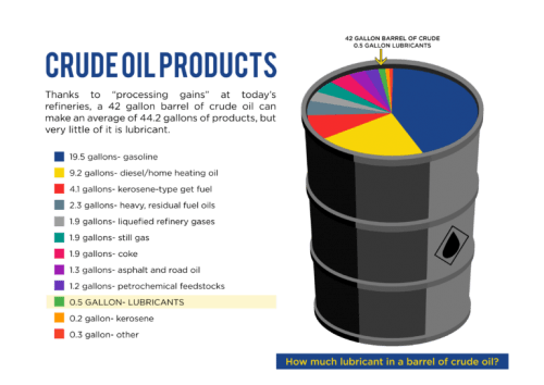 The typical barrel of crude is 42 gallons. According to the American Petroleum Institute, only 0.5 gallons of crude oil in each barrel are used to make lubricants.